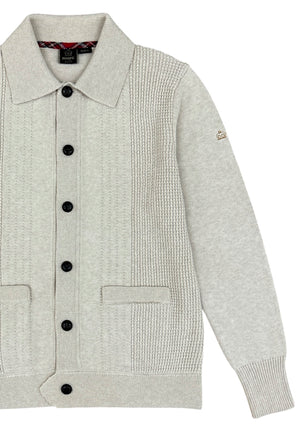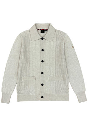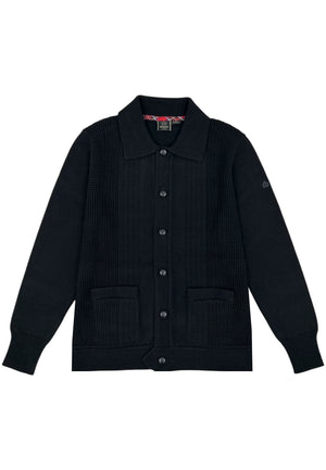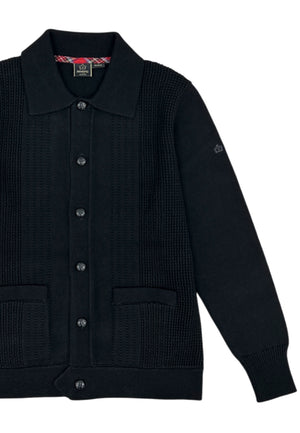 A sleek take on classic Mod knitwear. Crafted from a textured cotton blend with a structured collar and button-through front, this cardigan balances vintage detailing with modern attitude. Finished with subtle crown embroidery — understated, sharp, and effortlessly British.