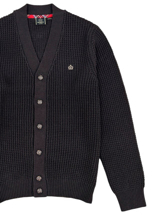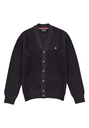 A nod to our heritage with the Grayson, a “Skin” classic waffle knitwear cardigan with large branded buttons. With striking waffle stitching and a subtly embroidered crown logo on the left breast, this is a real statement piece. Pair with a crisp white button-down shirt, blue jeans, and if your all in, Boots & Braces!