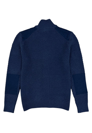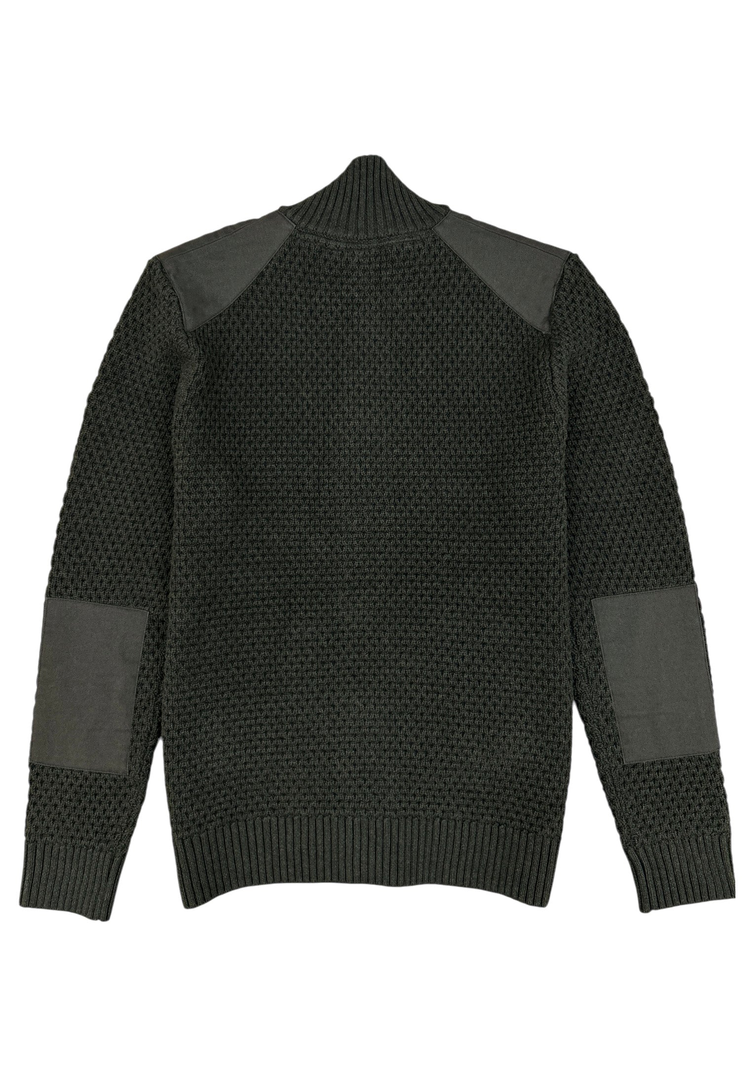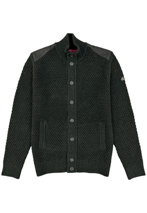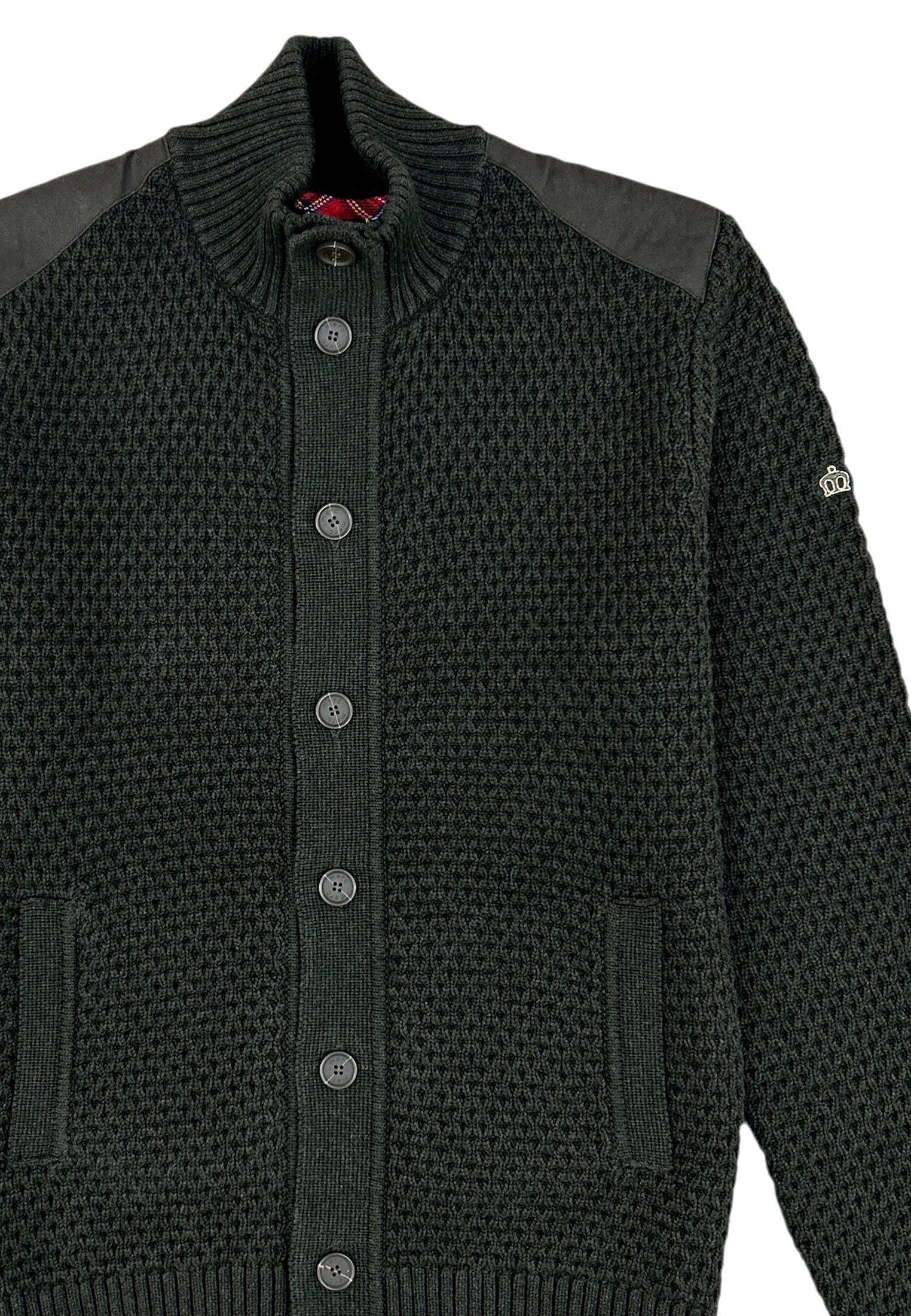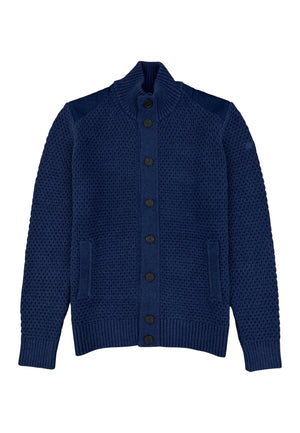 A textured classic with a refined edge. This heavy knit cardigan features a structured waffle weave, contrast shoulder panels, and a ribbed collar that keeps things sharp. Buttoned through the front with side pockets, it’s the perfect mix of comfort, craftsmanship, and confident style.